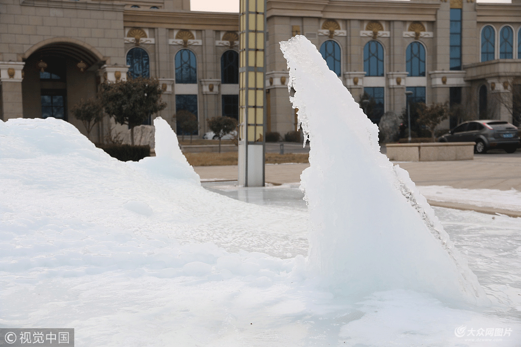 2018年1月27日,山東濱州,持續(xù)低溫天氣令氣溫驟降,當(dāng)?shù)匾患掖缶频觊T前的大型噴泉被凍成了“冰山”,引來許多市民前來圍觀。