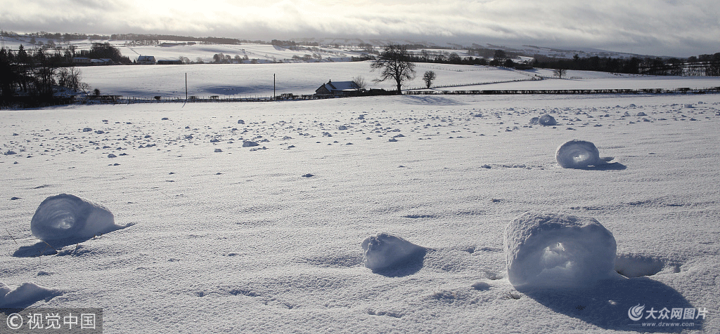 2018年1月30日訊(具體拍攝時間不詳),據(jù)英國《每日郵報》1月18日報道,在英國蘇格蘭南拉納克郡的格拉斯福德發(fā)現(xiàn)了一片不尋常的雪卷。尤妮斯·克拉克(Eunice Clarke)在南拉納克郡的格拉斯福德發(fā)現(xiàn)這一片不同尋常的雪卷。她說道:“我們這里下了一早上的雪,在我出門遛完狗回來閑逛的時候,發(fā)現(xiàn)了這些雪卷,它們就像微型的干草卷,只是是由雪做成的!