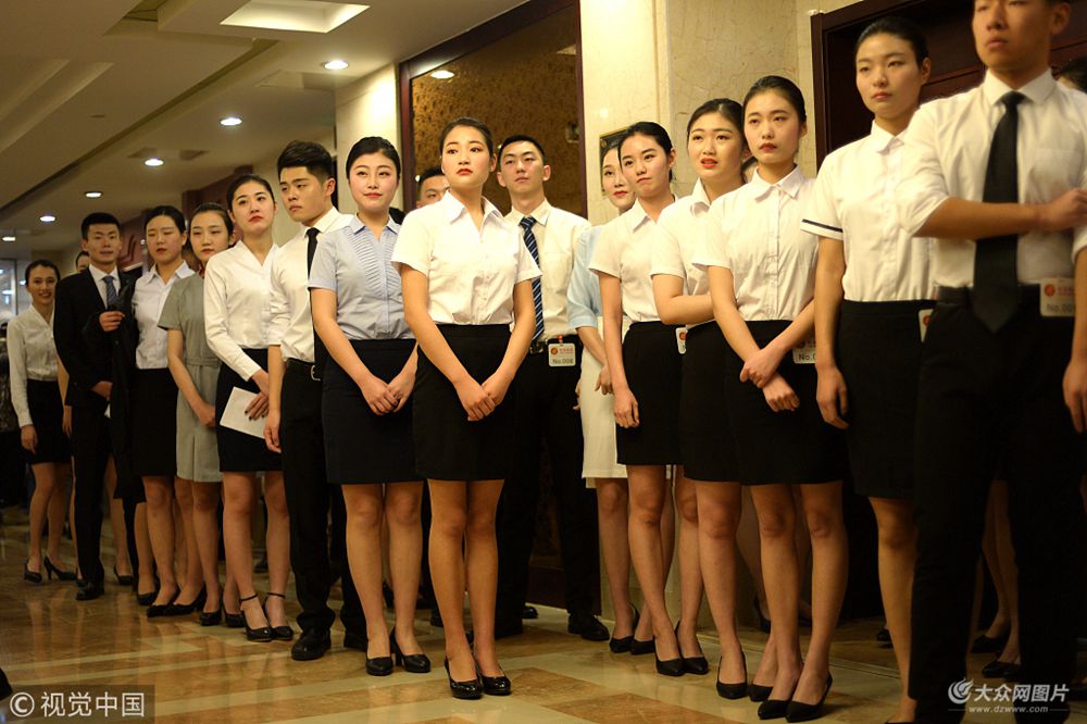 2018年1月31日,山東省濟南市,國內(nèi)9家航空公司聯(lián)合來濟南招聘空中乘務(wù)員,招聘現(xiàn)場吸引了600多名帥哥美女前來報名,由于報名人數(shù)較多,報名現(xiàn)場會議室和走廊里全部坐滿了人,女孩們席地而坐化妝或休息,等待進場面試。
