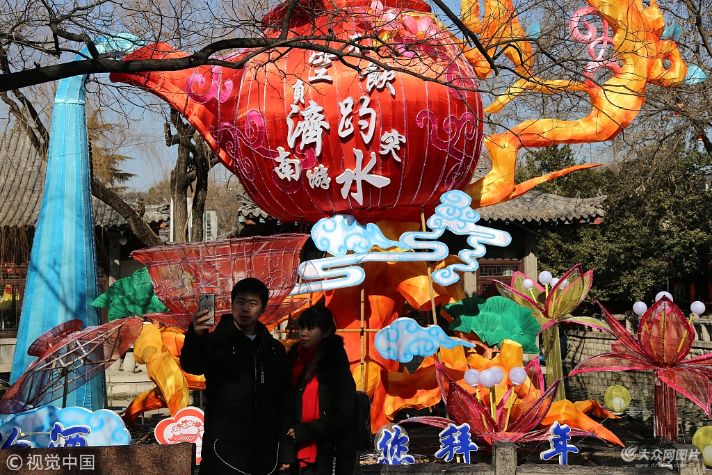 2018年2月6日,濟(jì)南趵突泉花燈接近尾聲,多組花燈造型基本完成,在園區(qū)看到不少市民用手機(jī)與花燈搶先合影分享與親朋友好。