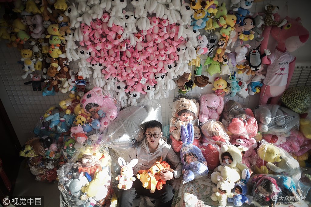 2018年2月4日,天津,即將到來的春節(jié),正好連著情人節(jié)。走進曉強的家里,撲面而來的是滿墻的毛絨娃娃。為了應景,他在墻上拼出了一個心形!芭阄疫^節(jié)的,也許就是它們了!彼f。