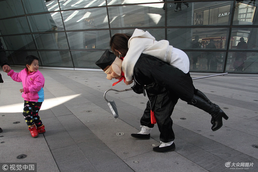 2018年2月10日,在山東濟(jì)南泉城廣場上,一位男子趙維勇扮演豬八戒在街頭逗樂路人,并且現(xiàn)場表演豬八戒背媳婦逗路人開心,還提倡大家過年禁止放鞭炮。