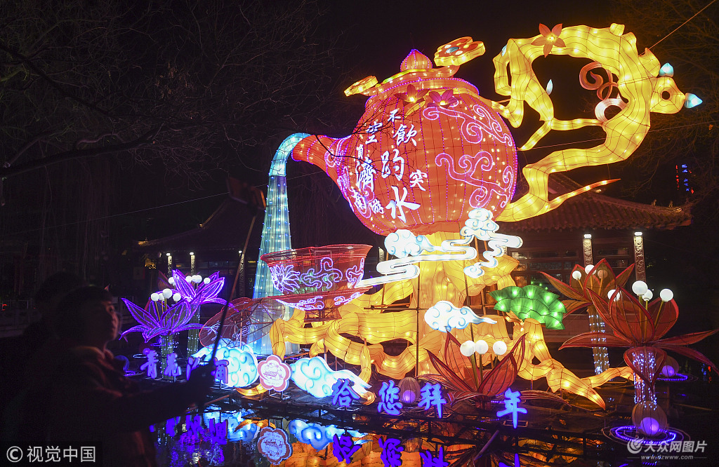 2018年2月11日,濟南,高13米,長40米的“龍騰泉城”燈亮燈。當日,第39屆濟南趵突泉迎春花燈會試亮燈,以“燈燦、泉旺、湖山新”為主題的60組花燈,吸引不少游客前來觀賞。 張勇(山東分社)/中新社/視覺中國