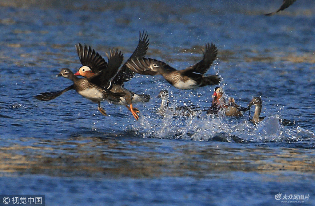 2018年2月12日,安徽黃山,成雙結(jié)對(duì)的珍稀野生鴛鴦結(jié)伴游戈新安江,覓食戲水,沐浴早春陽(yáng)光。