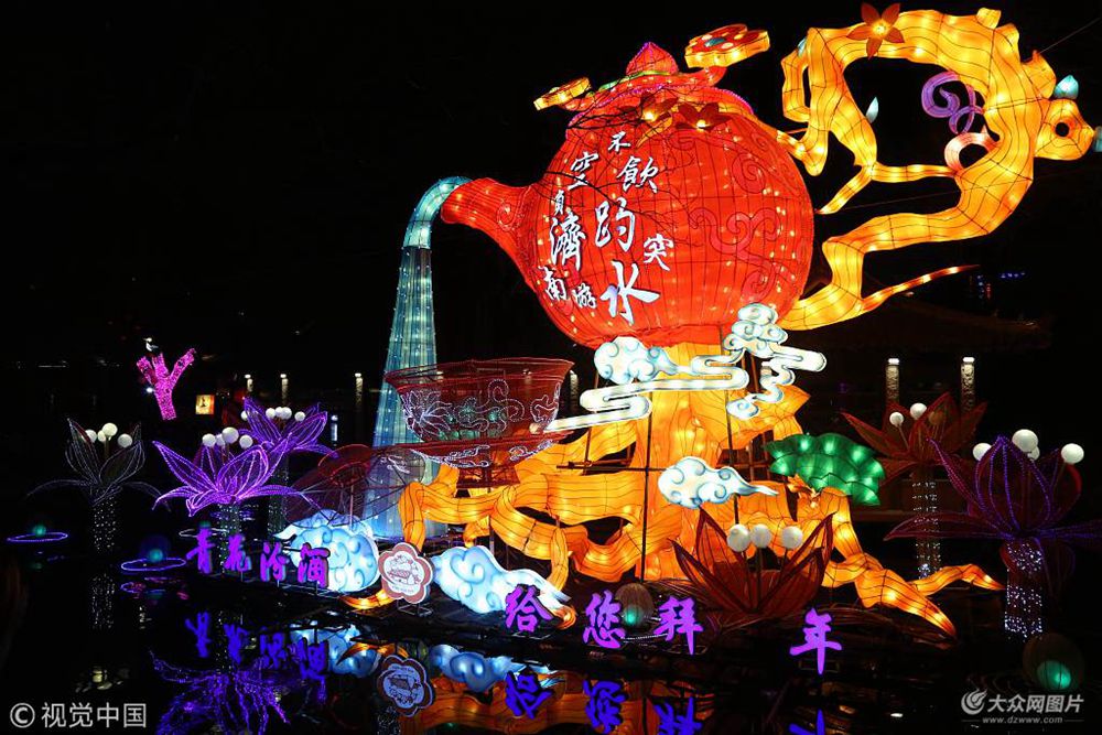 2018年2月17日,正月初二,濟(jì)南趵突泉公園內(nèi),不少游人在泉畔欣賞璀璨的花燈,并紛紛合影留念。