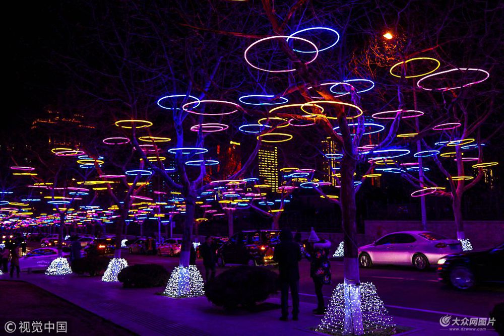 2018年2月17日晚上,青島西海岸新區(qū)鳳山路兩旁梧桐樹(shù)上安裝的寓意團(tuán)圓主題的彩色光圈流光溢彩,將狗年正月里的新春夜晚裝點(diǎn)的格外靚麗。