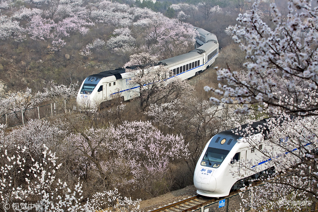 2018年4月2日,北京,居庸關花海景區(qū)迎來觀賞高峰,山桃花杏花開了,火車行進在花叢中美如仙境。
