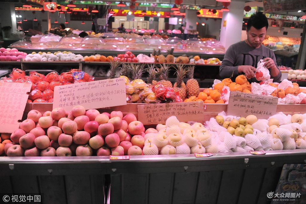 2018年4月4日,在濟(jì)南一社區(qū)菜市場,水果攤老板耿先生,每天將從網(wǎng)上看到的英語勵志句子寫在紙牌上,擺在水果攤前。不但時刻鼓勵自己,又讓自己的水果攤顯得更有文化底蘊(yùn)。一時間,水果攤紅遍社區(qū),成了網(wǎng)紅水果哥。耿先生說,下次他打算寫點(diǎn)古詩詞。因?yàn)槭昵,自己曾在?jì)南市小學(xué)生古詩詞背誦比賽中獲得第二名。古詩詞的水平不比英語差。