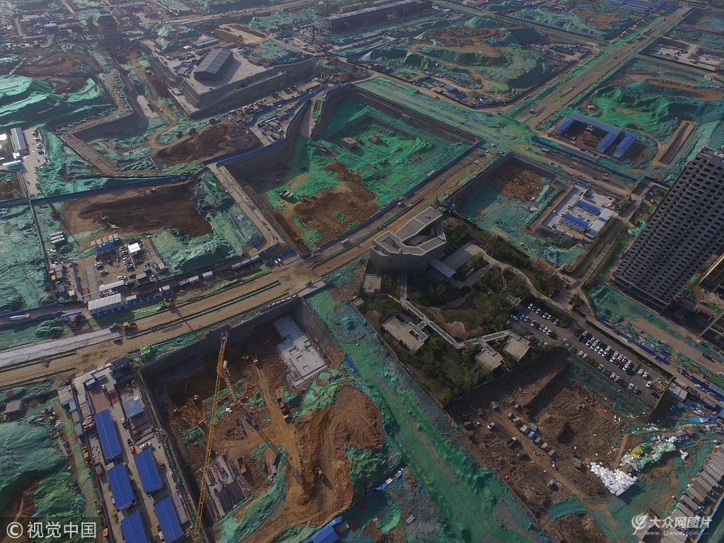 2018年4月9日,濟南,從航拍畫面看到,被譽為CBD之“山”的主塔樓綠地國際金融中心,超高層基坑已挖好,基坑深度超過20米,截至2017年底核心筒達(dá)到正負(fù)零。