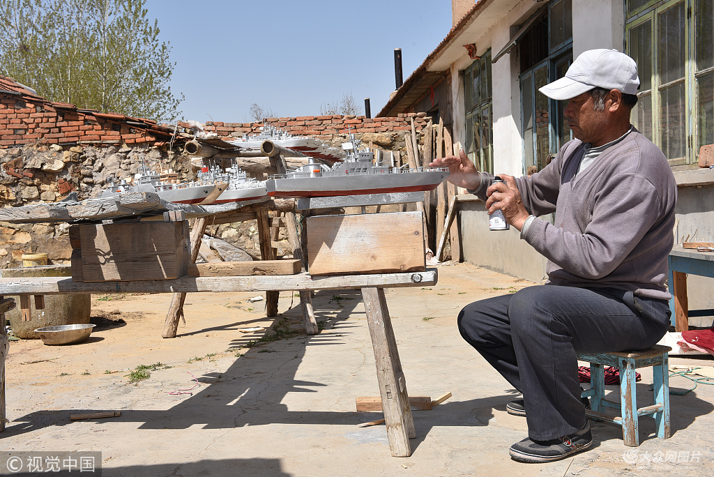 2018年4月16日,在山東省日照市山海天旅游度假區(qū)兩城街道肖家村,今年60歲的郭長海在展示他剛剛制造完畢的26艘“驅(qū)逐艦”模型。從2005年開始,他憑借自己的想象,不畫圖紙,利用廢舊材料,先后純手工制作了近百艘不同規(guī)格的軍艦?zāi)P停渲?艘"軍艦"可實現(xiàn)水陸兩棲,并可模擬槍炮發(fā)射。
