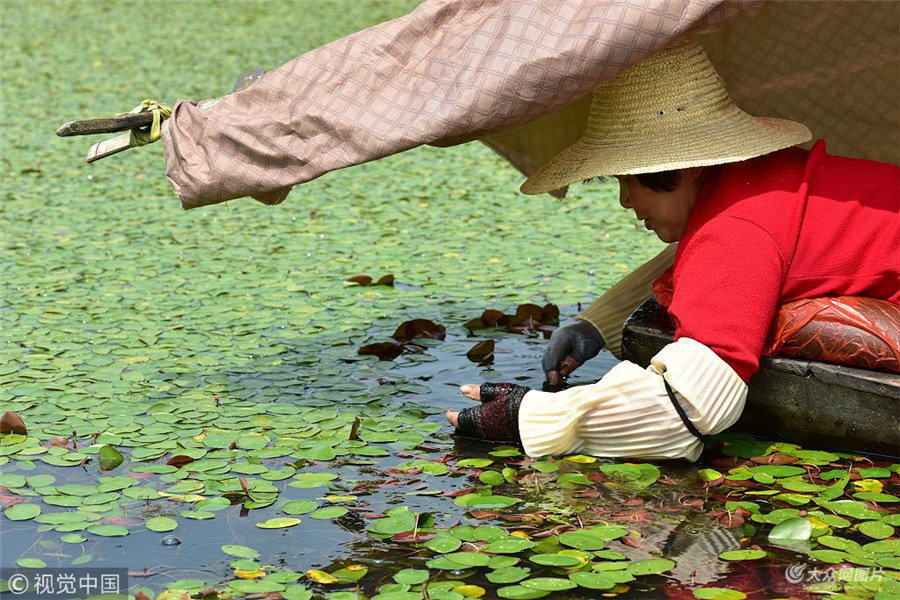 舌尖美味西湖莼菜開采 村民一天趴船十多小時