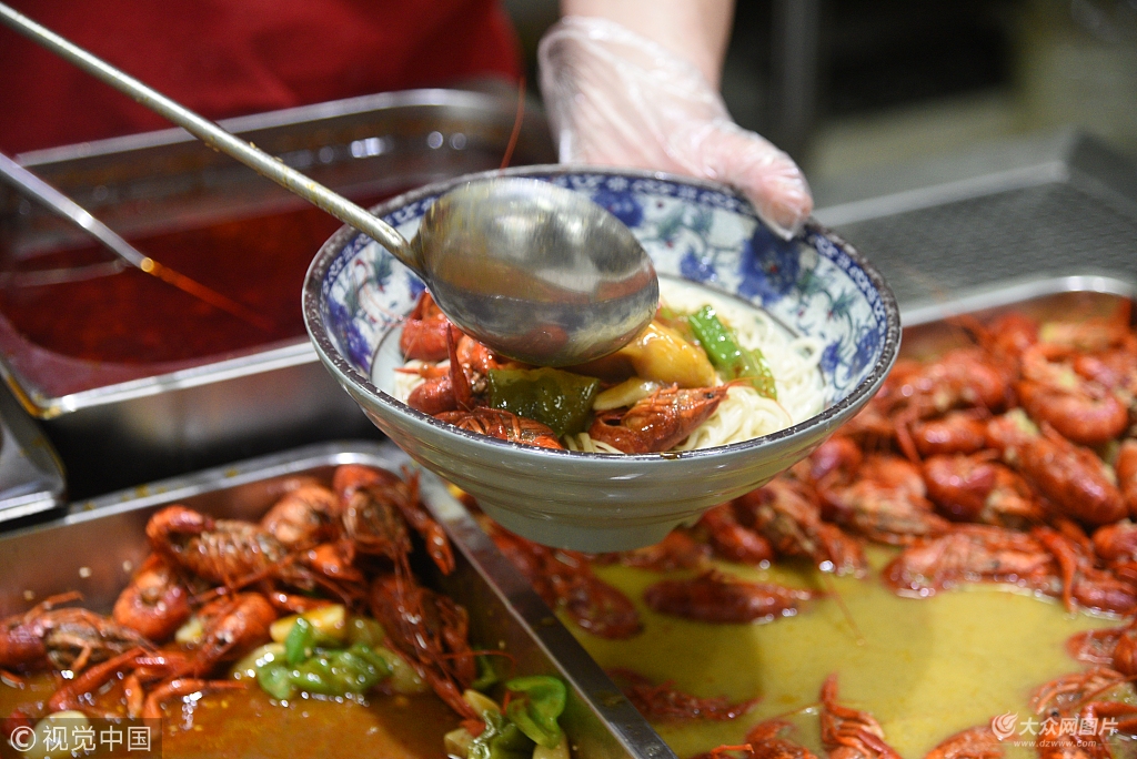 2018年5月4日,江蘇省南京市,河海大學(xué)內(nèi)推出的15元一份的龍蝦面。