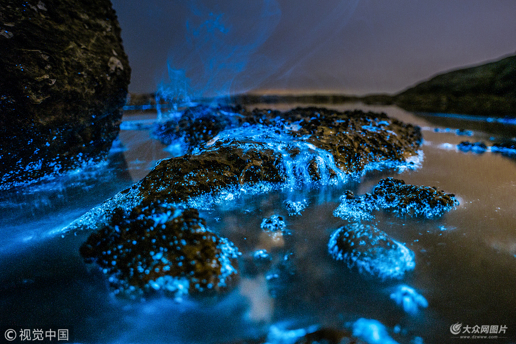 2016年6月13日,遼寧省大連市。大連甘井子區(qū)小黑石海域出現(xiàn)"熒光海"景象。遠遠地看,猶如藍色星空墜落海洋,美到令人窒息。