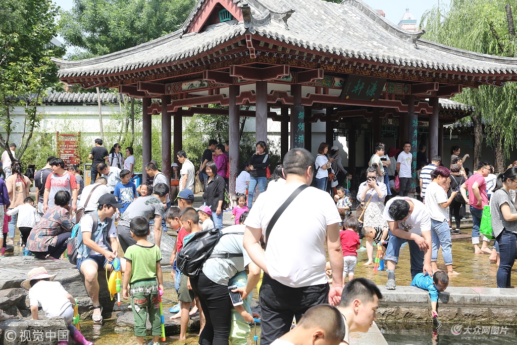 2018年5月13日,在山東濟(jì)南五龍?zhí)讹L(fēng)景區(qū)內(nèi),眾多市民扎堆聚集在泉水石縫中感受清涼,現(xiàn)場(chǎng)十分火爆。當(dāng)日,最高氣溫達(dá)到33攝氏度左右,天氣逐漸變熱,市民用不同方式享受清涼。