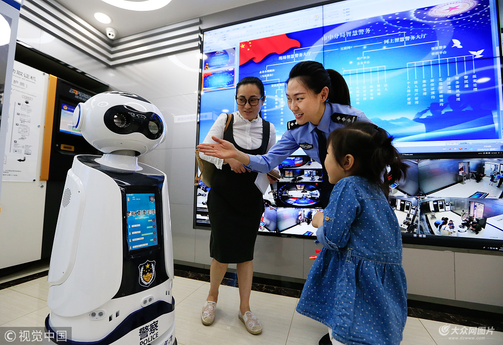 2018年5月9日,濟南,智慧警局大廳內(nèi)的機器人“小智”吸引了群眾的目光。圖為民警正在給一位小朋友講解“小智”的使用方法。