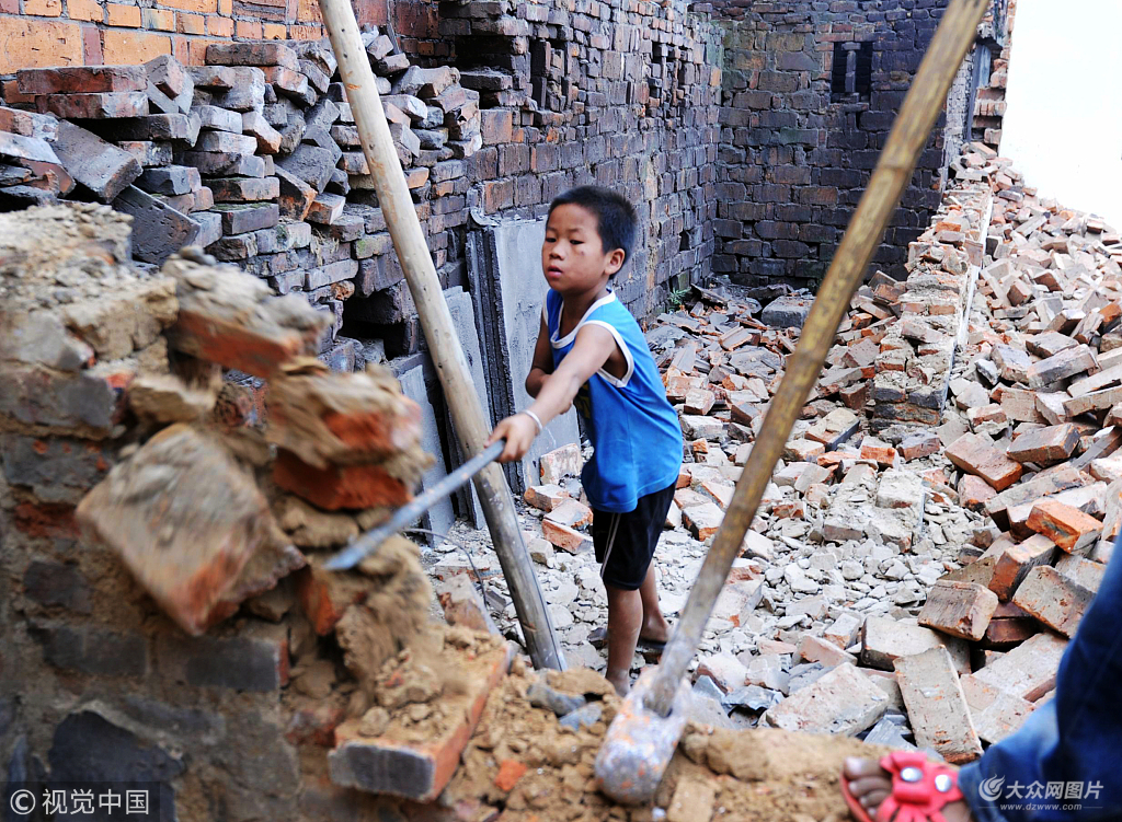 2011年7月11日,南昌,11歲的羅家文在撬磚。