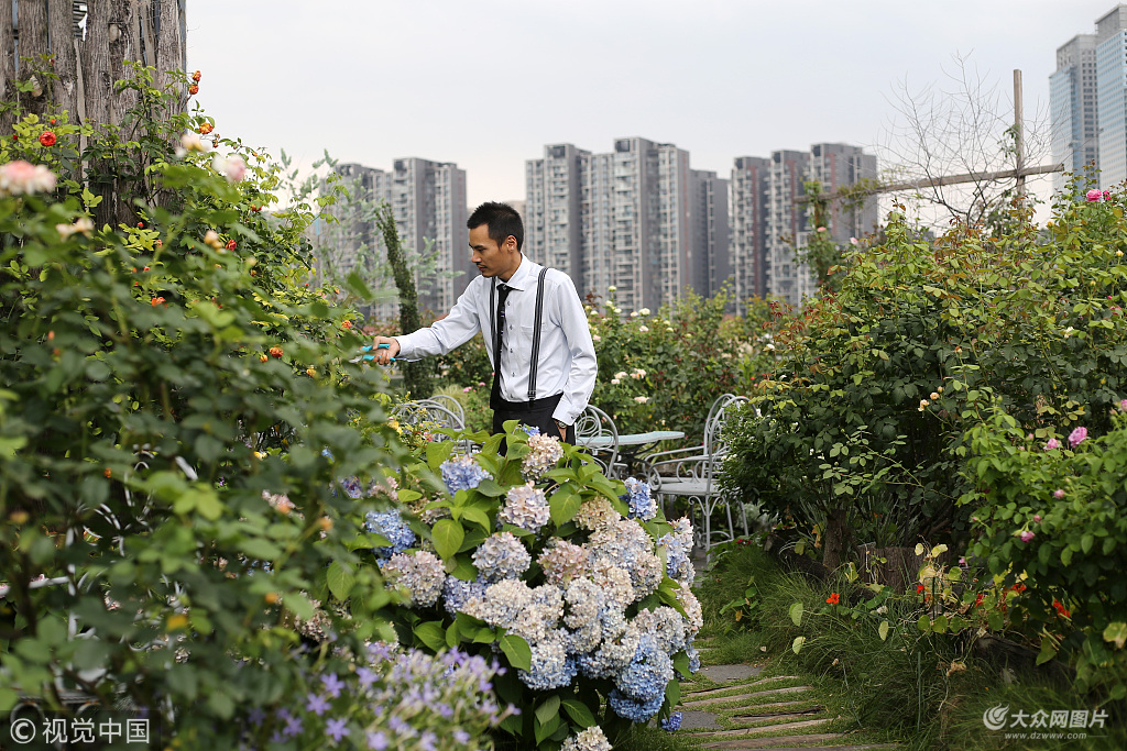 2018年5月31日,劉顏輝正在修剪植物。成都華府大道地鐵站附近的“植寤實(shí)驗(yàn)室”,一對(duì)夫婦在樓頂無(wú)土栽培種植了400多種植物。