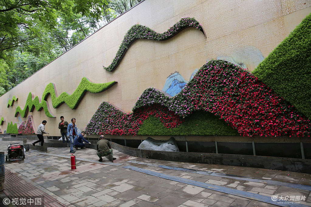 花墻的背景畫是一幅古色古香的山水畫,畫和花結合打造西安“最美”花墻。圖片作者:魏永賢/視覺中國