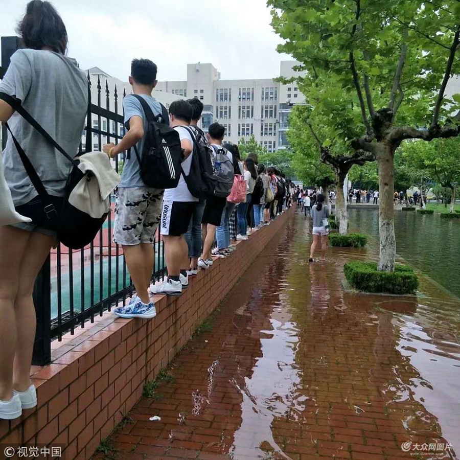 6月26日,山東煙臺(tái)大學(xué)暴雨后道路積水嚴(yán)重,不少學(xué)生為了上課需要"飛檐走壁"。