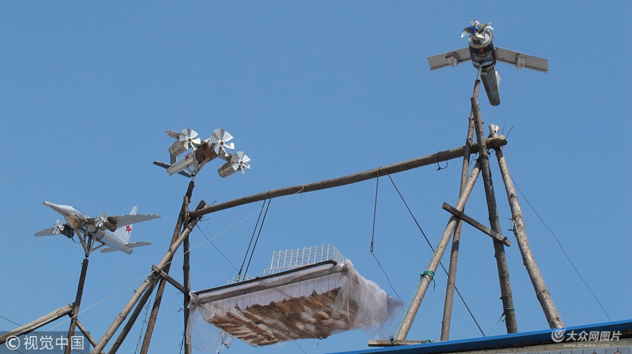 2018年6月24日,山東省日照市一家農(nóng)家樂(lè)海鮮店,店主人在平房頂上,安裝了3架“山寨”F35戰(zhàn)斗機(jī),在微風(fēng)中,三架山寨戰(zhàn)斗機(jī)的“螺旋槳”呼呼作響,而且機(jī)身還能左右搖擺,吸引了不少過(guò)往居民駐足觀看。