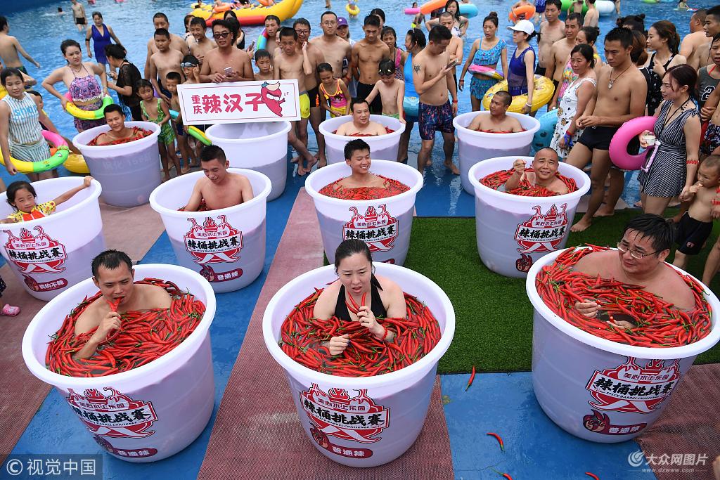 2018年7月7日,重慶涪陵紅酒小鎮(zhèn)水上樂園舉行辣桶挑戰(zhàn)賽,吸引了不少民眾在高溫天氣下體驗熱辣感覺。活動現(xiàn)場,大型塑料水桶內(nèi)泡滿了各種類型的辣椒。游客如能堅持在辣椒水中浸泡5分鐘就能獲得活動主辦方送出的禮品。 陳超(重慶分社)/中新社/視覺中國