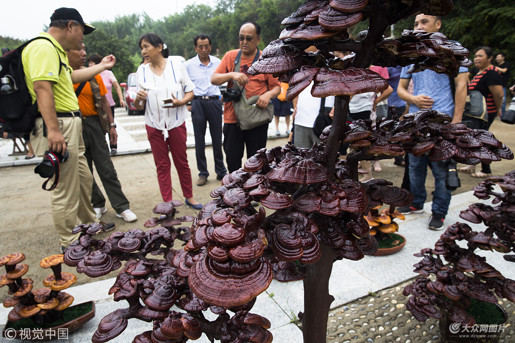 2018年7月10日,在濟(jì)南平陰縣孔村鎮(zhèn)七彩谷食用菌基地展示的靈芝盆景。它們?cè)煨推嫣、一株一景,像一件件精美的藝術(shù)品。根據(jù)品種、大小、形態(tài)的區(qū)別,每盆售價(jià)在幾百元到幾千元不等。