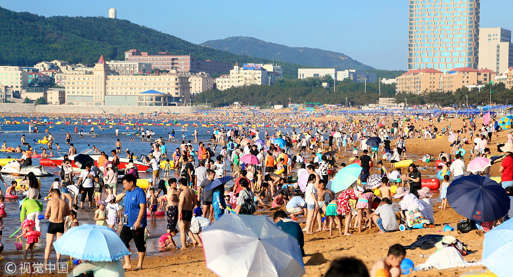2018年7月14日,山東威海國際海水浴場,游客人山人海 如下餃子般擠爆海水浴場。旅游旺季和連日來的高溫催熱威海國際海水浴場的旅游經(jīng)濟(jì),萬余人擠爆國際海水浴場暢享清涼。