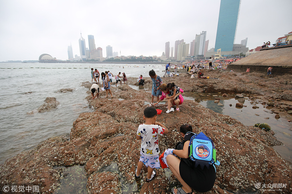 2018年7月20日,游人在青島棧橋景區(qū)趕海拾趣。夏日炎炎,棧橋避暑旅游火爆,退潮時(shí)灘涂礁石區(qū)大批游人捉螃蟹挖蛤蜊摸魚兒,享受大海樂趣清涼度夏。
