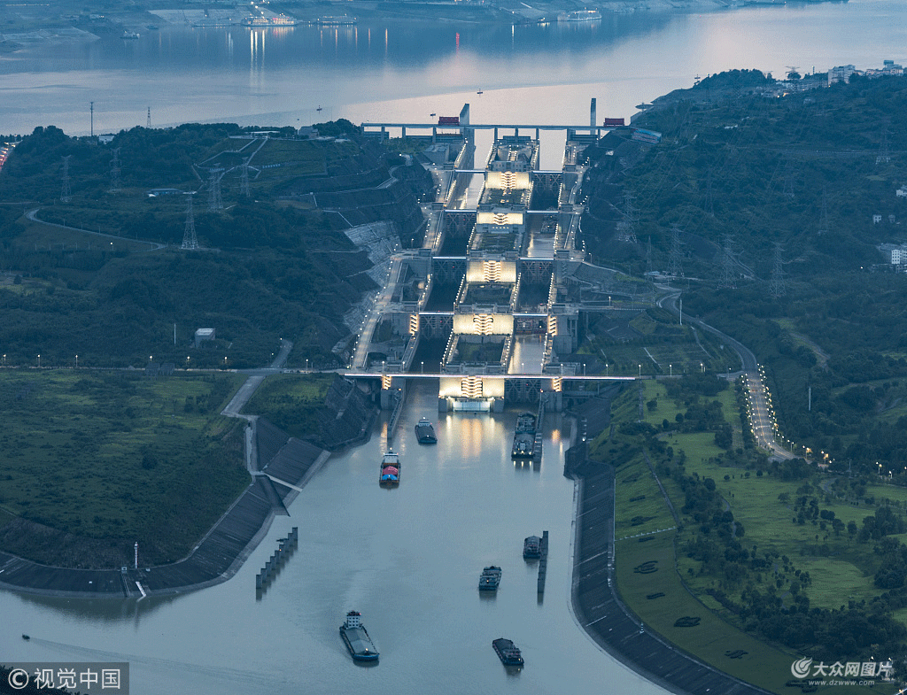 2018年8月1日,湖北宜昌,船舶有序通過(guò)三峽五級(jí)船閘。