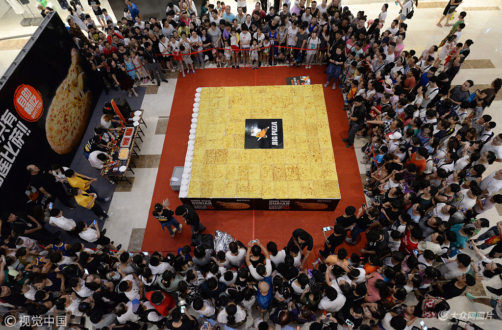 2018年8月4日,河北邯鄲,美樂城內(nèi)廣場上擺著一份16平方米的巨型披薩,市民可以免費(fèi)品嘗。據(jù)悉,這塊巨型披薩可以供千人分食。圖片作者:郝群英/視覺中國