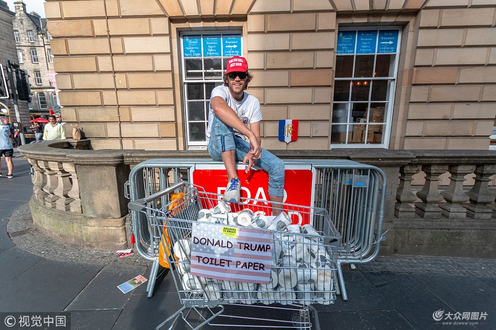 2018年8月8日訊(具體拍攝時間不詳),英國愛丁堡,29歲的Tim Baker在愛丁堡邊緣藝術(shù)節(jié)上售賣印有美國總統(tǒng)特朗普頭像的衛(wèi)生紙。按照一卷3磅兩卷5磅的價格,僅僅4天的時間他就賣出了一千卷,照這樣的速度,一周內(nèi)便能收入四千多英鎊(約合人民幣4萬元左右)。