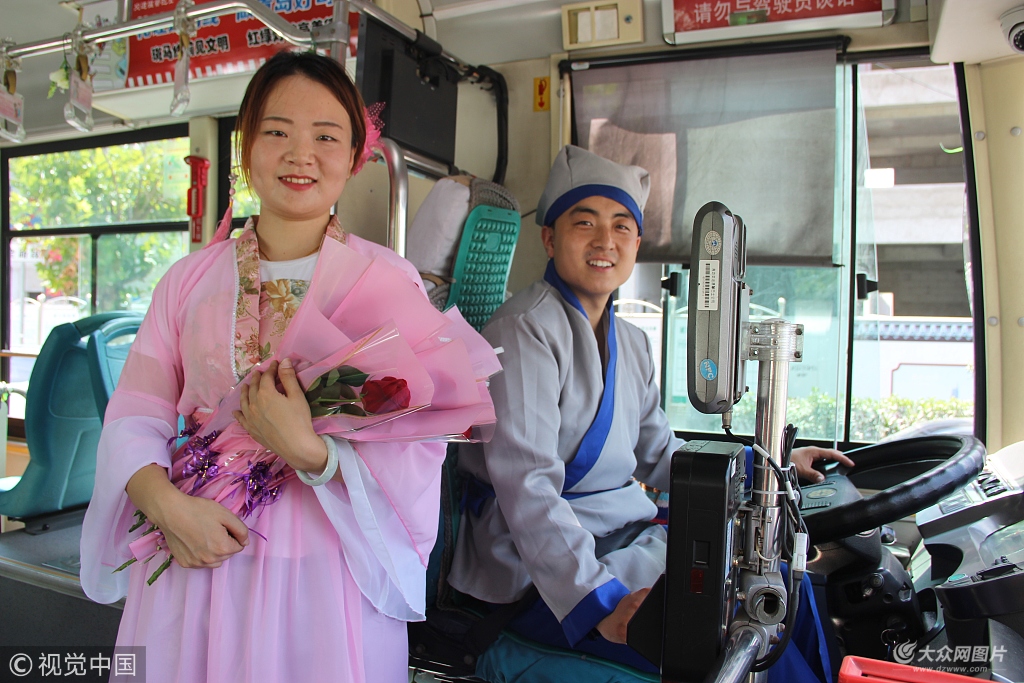 2018年8月16日,在交運(yùn)集團(tuán)青島溫馨巴士一輛613路車上,駕駛員劉順與其妻子王琳琳變裝“牛郎織女”為車上乘客送上玫瑰花。同時(shí),車廂還被打造成七夕表白專列,設(shè)立“七夕故事”、“脫單漂流瓶”、“表白墻”、“招桃花專座”等多個(gè)板塊,鼓勵(lì)平時(shí)羞于表達(dá)的乘客大膽說(shuō)“愛(ài)”。江敏/視覺(jué)中國(guó)