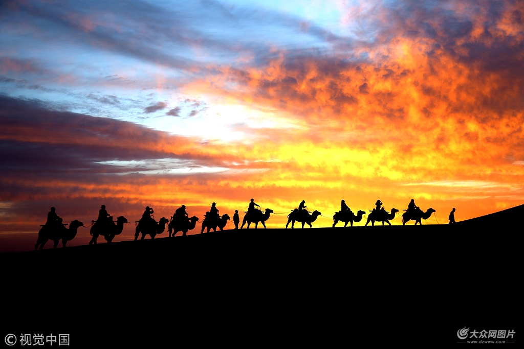 2018年8月19日,游客在甘肅省敦煌市鳴沙山月牙泉景區(qū)欣賞大漠風光。圖片作者:張曉亮/視覺中國
