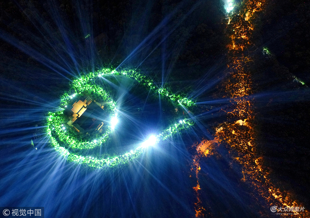 2018年8月19日,南京,2018紫金山七夕熒光跑正式啟動(dòng),而美齡宮“項(xiàng)鏈”也首次被燈光點(diǎn)亮。五彩的燈光照射在高大的梧桐上,形成了變幻的風(fēng)景。圖為航拍美齡宮“項(xiàng)鏈”首次點(diǎn)亮。