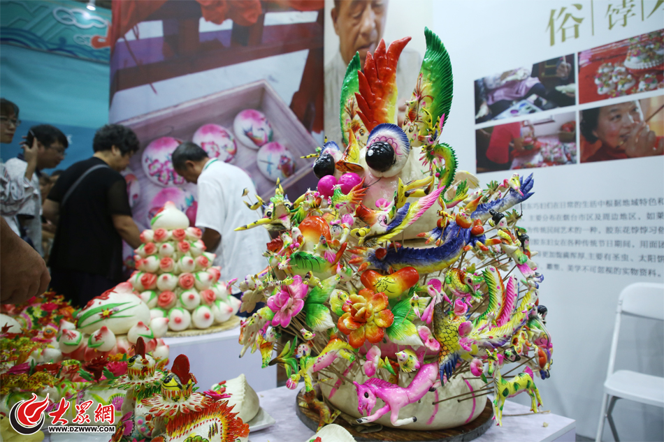 大眾網9月13日濟南訊 今天上午,第五屆中國非物質文化遺產博覽會在濟南開幕。其中,獨具特色的膠東大餑餑展臺吸引了不少參觀者的目光。據了解,其中一個名為“大圣蟲”的作品用了約80斤重的面粉,耗時約12天完成。(大眾網、山東24小時記者 亓翔)