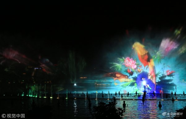 濟(jì)南大明湖上演燈光“明湖秀” 絢麗多彩醉游人