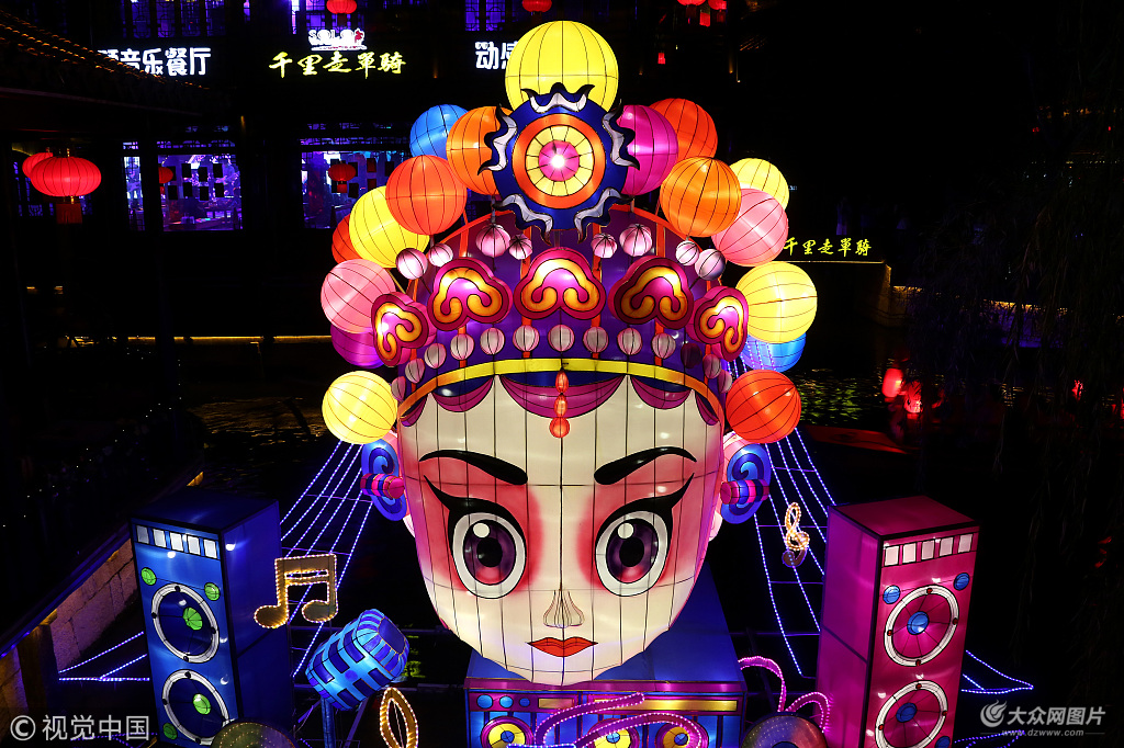2018年9月22日晚,山東棗莊臺兒莊古城,游船從安裝在水上的臉譜花燈前行駛。圖片作者:吉喆/視覺中國