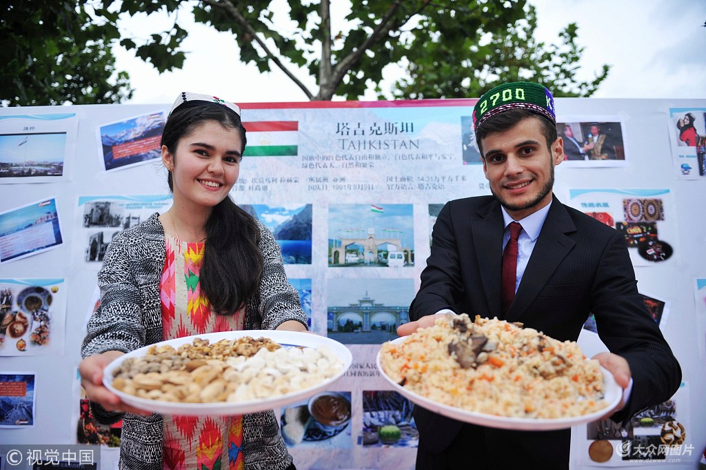 2018年9月25日,青島西海岸新區(qū),中國(guó)石油大學(xué)(華東)國(guó)際教育學(xué)院,塔吉克斯坦留學(xué)生在展示民族美食。