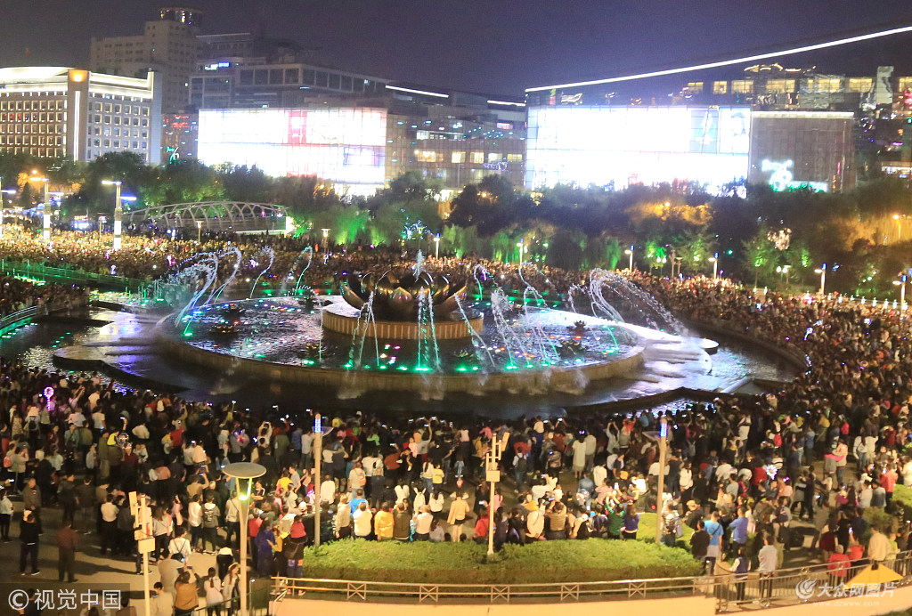 2018年10月3日晚上,濟(jì)南,泉城廣場(chǎng)上人山人海,眾多游客聚集在此用手機(jī)紀(jì)錄音樂(lè)噴泉美景。