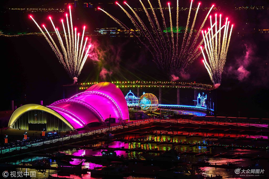 2018年10月4日,山東青島,從浮山灣畔高樓上俯瞰的國慶燈光秀景觀。