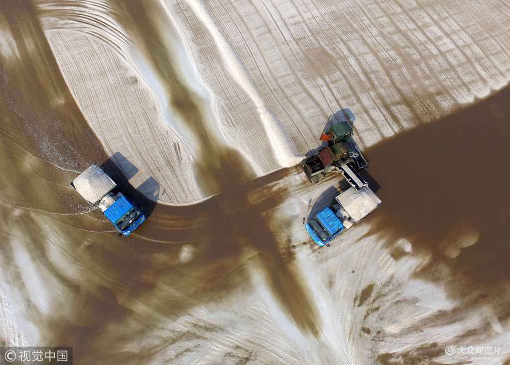 2018年10月4日,山東省濱州市沾化區(qū)北部鹽場(chǎng)工人在結(jié)晶池操作機(jī)械設(shè)備收獲秋鹽。