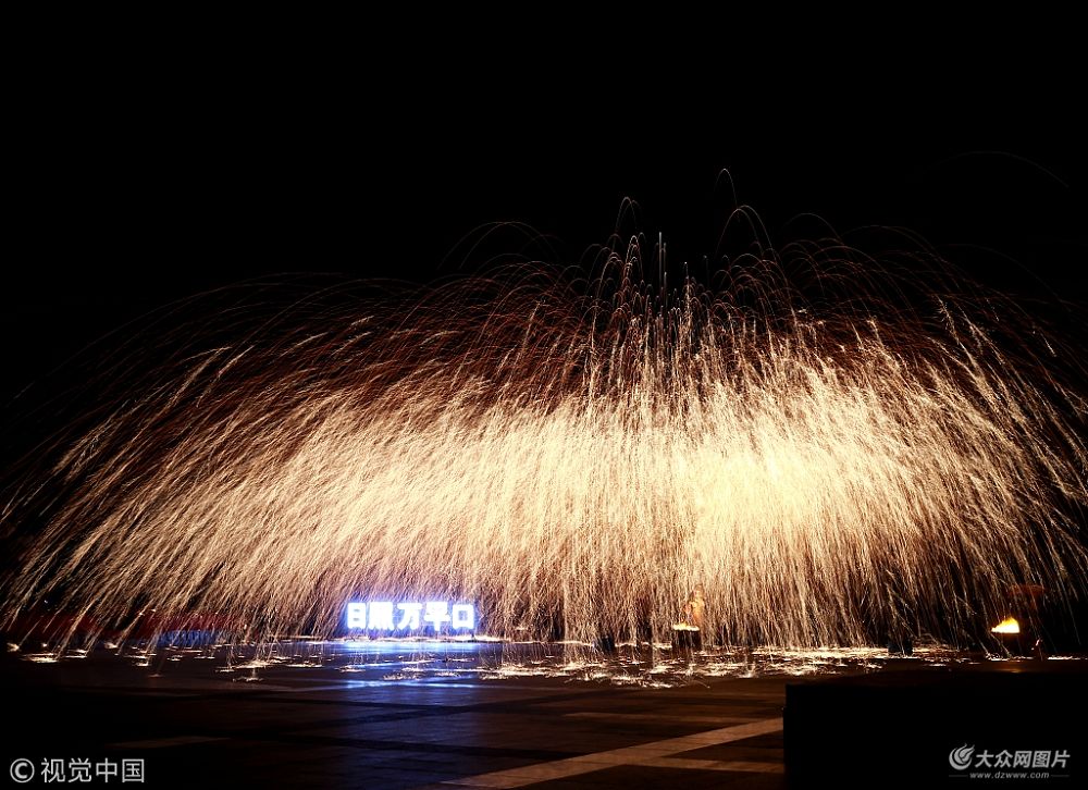 2018年10月15日,山東日照,在萬平口景區(qū)內(nèi)的非物質(zhì)文化遺產(chǎn)打鐵花演出,流光溢彩美如畫。