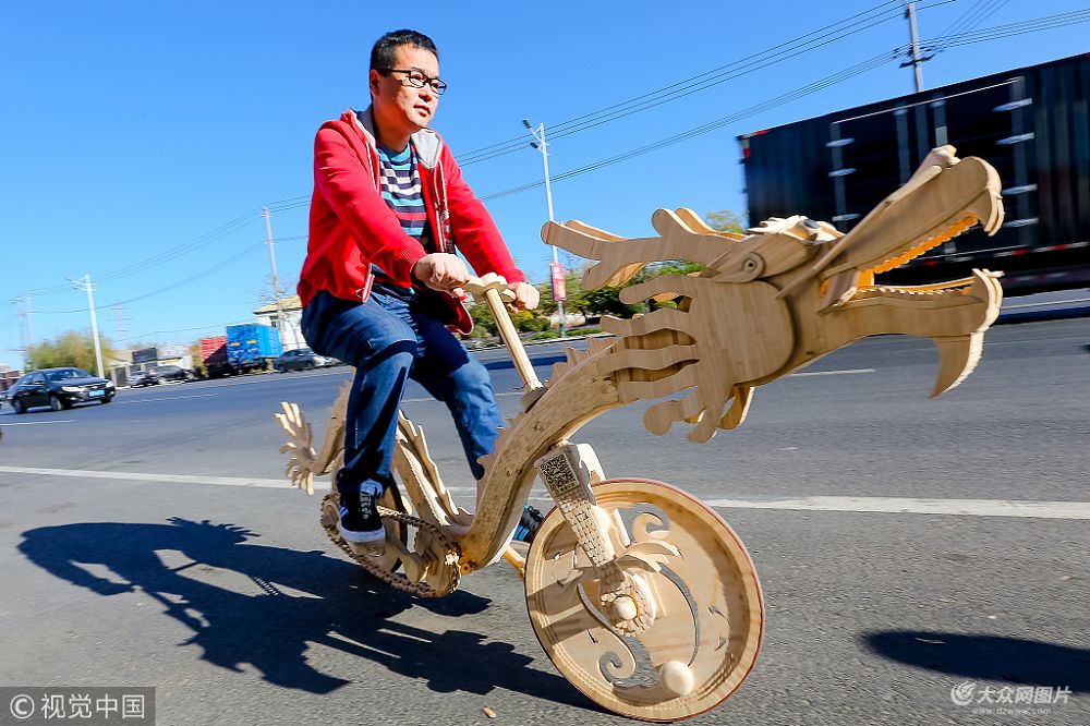 2018年10月15日,遼寧鐵嶺,孫超的中國龍雪糕棍自行車可以像普通車子一樣騎,路上很拉風。這輛特殊的自行車耗費了22000多根雪糕棍,全長2450mm、寬480mm、高1000mm,重量約20.5公斤。龍頭至龍尾共裝飾有各色燈珠310顆,龍頭內置多項小機關、小功能,包括遙控燈光、報警鈴聲、音樂播放器、音箱、驗鈔工具等。