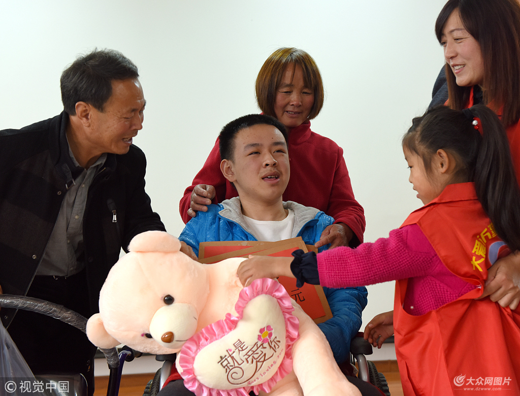 2018年10月20日,山東臨沂,愛心群眾前來看望教師杜風(fēng)亮一家,送來愛心捐款和禮物。