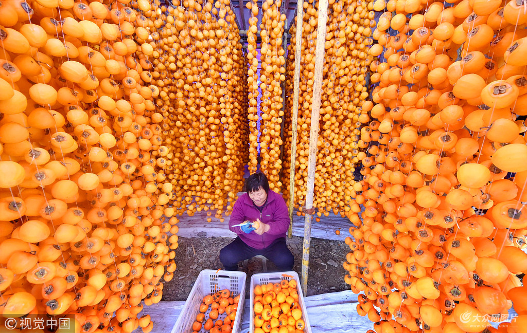 2018年10月23日,山東省淄博市沂源縣悅莊鎮(zhèn)陳家官莊村的農(nóng)民在將加工的柿子進(jìn)行吊曬。