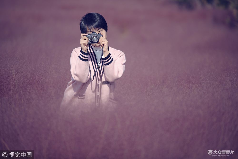 2018年10月30日,山東日照,市民在重慶路一片“紅云”鋪地的花草間拍照留影。