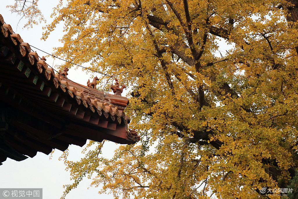 2018年11月4日,山東泰安。泰山岱廟景區(qū)內(nèi)的數(shù)棵千年銀杏樹(shù)開(kāi)始陸陸續(xù)泛著金黃色。