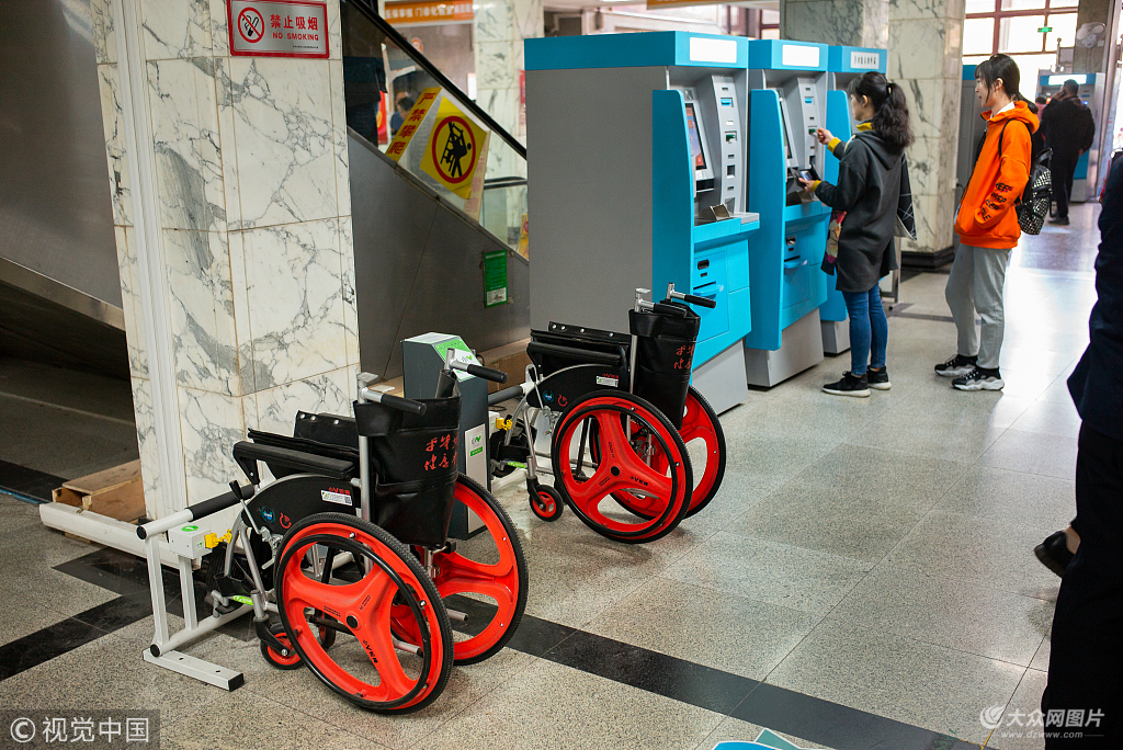 2018年11月4日,濟(jì)南,在山東省中醫(yī)院看到,一樓大廳樓梯旁,有橙紅色輪轂的共享輪椅擺放在那里,供病人使用。