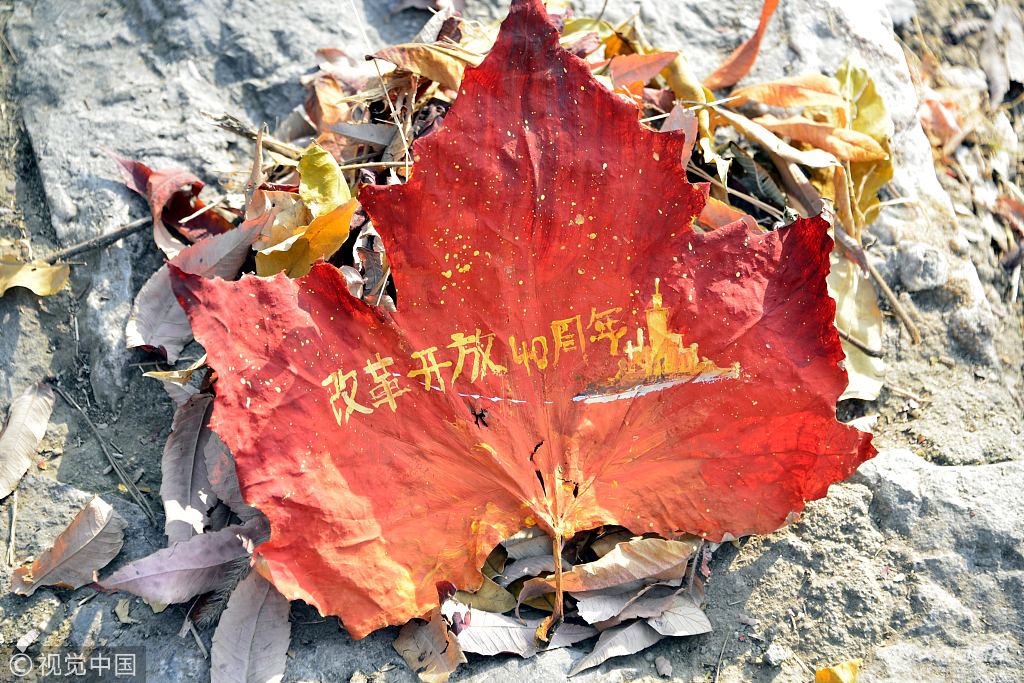 山東聊城:大學(xué)生樹(shù)葉涂鴉美容紀(jì)念改革開(kāi)放40周年