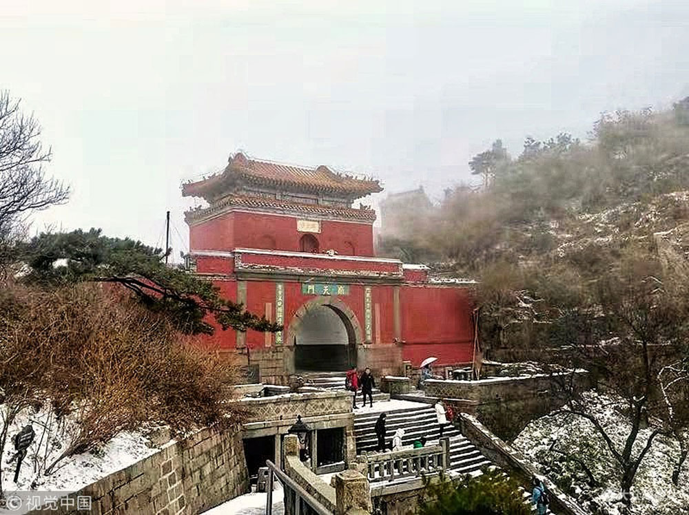 2018年11月7日,山東泰安,泰山景區(qū)迎來了入冬的第一場雪,清晨被雪覆蓋的南天門。